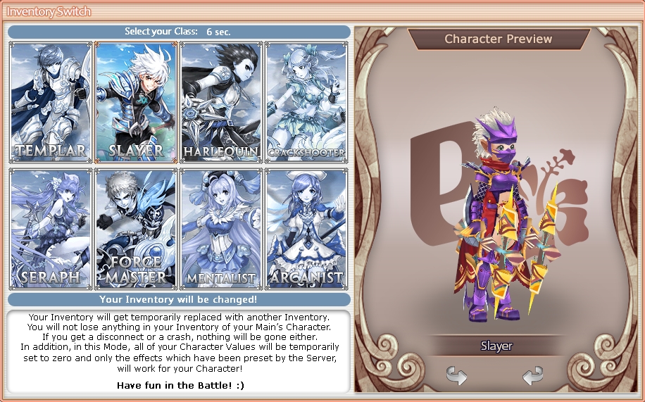 Für unser Battleground System benötigst du keine Ausrüstung. Du bekommst eine vom Server. Du kannst auch jede Runde deine Klasse wählen.