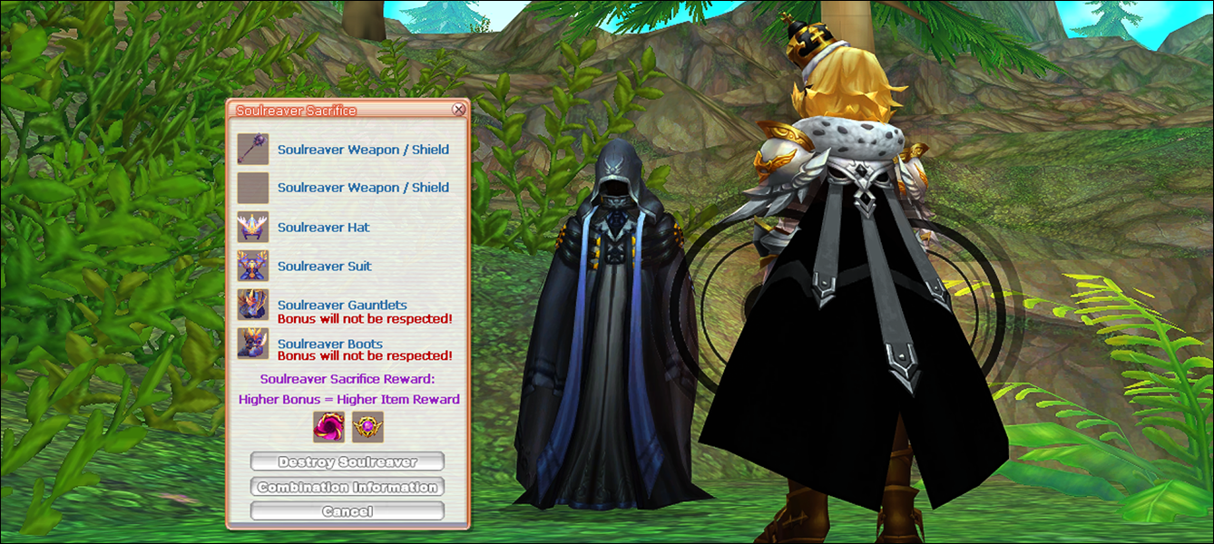 Folgende Items können erhalten werden, je nach Bonuswerten eurer Sets / Waffen: Die Bonuswerte müssen sinn ergeben zu der Klasse wie diese Gespielt werden! Es können z.b. keine INT Slayer schuhe genutzt werden! Mittlere Bonuswerte: (Power-Up Belohnung) - Damage Power-Up (Medium): PvE Damage+10%, PvP Damage+5% (Damage Set / Waffen Opferung) - HP Power-Up (Medium): HP+15%, Alle Statuswerte+20 (HP Set / Waffen Opferung) *Beide Power-Ups können gleichzeitig genutzt werden, aber die höheren können nicht zeitgleich aktiv sein! *Wird ebenfalls als Charakter Badge freigeschaltet! Hohe Bonuswerte: (Power-Up + Trance Modus Belohnung) - Damage Power-Up (High): PvE Damage+20%, PvP Damage+8% (Damage Set / Waffen Opferung) - HP Power-Up (High): HP+25%, Alle Statuswerte+35 (HP Set / Waffen Opferung) *Beide Power-Ups können gleichzeitig genutzt werden, aber die höheren/niedrigeren können nicht zeitgleich aktiv sein! *Wird ebenfalls als Charakter Badge freigeschaltet! Perfekte Bonuswerte: (Power-Up + Trance Modus Belohnung) - Damage Power-Up (Perfect): PvE Damage+25%, PvP Damage+12% (Damage Set / Waffen Opferung) - HP Power-Up (Perfect): HP+30%, Alle Statuswerte+50 (HP Set / Waffen Opferung) *Beide Power-Ups können gleichzeitig genutzt werden, aber die höheren/niedrigeren können nicht zeitgleich aktiv sein! *Wird ebenfalls als Charakter Badge freigeschaltet! Liste der Benötigten Bonuswerte auf den Sets / Waffen: Klicke Hier! Soulreaver Opferung: Trance Modus Freischaltung