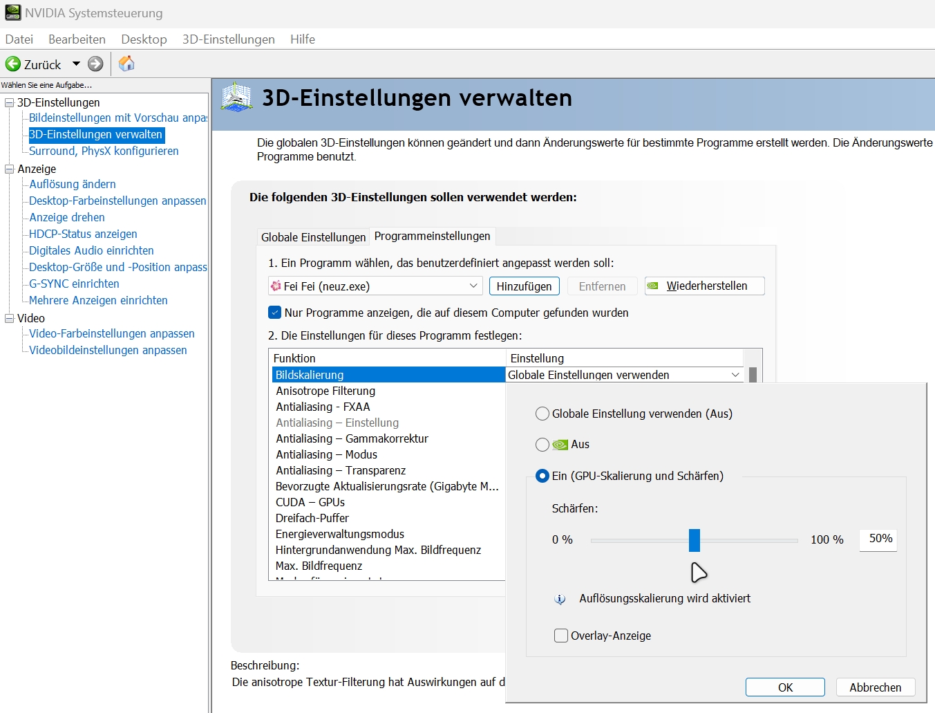Wenn das Spiel nach dieser Änderung für Sie unscharf erscheint, könnte das daran liegen, dass es nicht speziell für die 4k-Auflösung mit Windows-Skalierung konzipiert ist. In diesem Fall können Sie das Spiel mithilfe Ihres Grafikkartenprogramms schärfen (sofern Sie eine GPU in Ihrem Computer haben). Für Nvidia-Grafikkarten können Sie das Spiel Entropia\bin64\Neuz.exe in den 3D-Einstellungen hinzufügen und die Option zur Bildskalierungsschärfe verwenden. Für AMD-Grafikkarten sollte dies ebenfalls möglich sein, allerdings müssten Sie die Einzelheiten selbst recherchieren.
